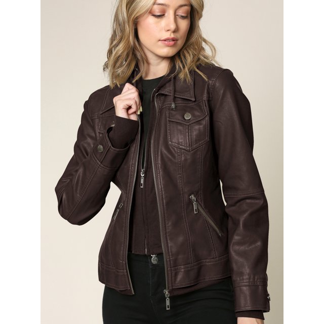 Made by Johnny Women’s Faux Leather Jacket with Hoodie XXL COFFEE